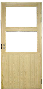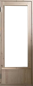 Puupaneeliovi raakalasilla. Ovessa erikoismallinen pintaristikko.