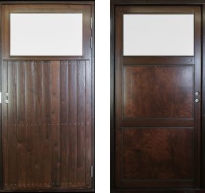 Mökkiovi, jossa ulkopuoli paneloitu, sisäpuolella vaneripeilit. Lakattu puunväri.